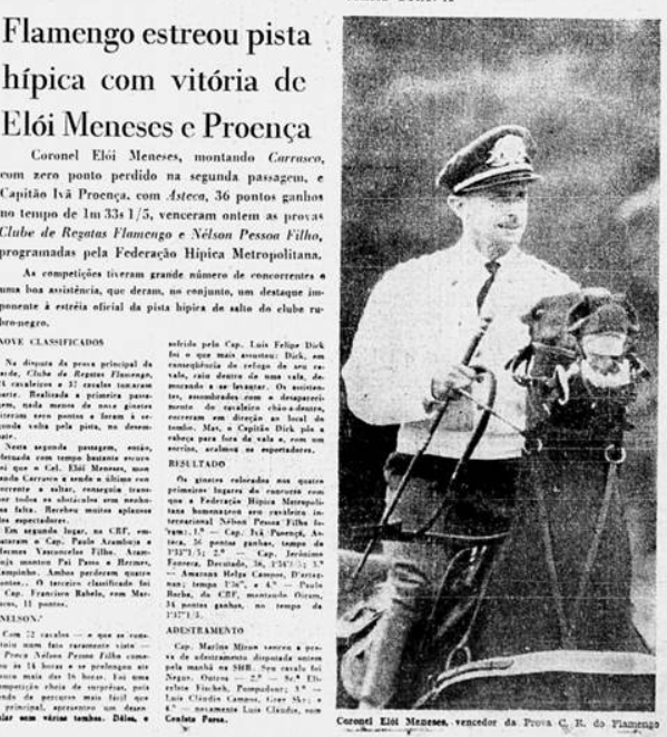 O Coronel Elói Meneses venceu a Prova Club de Regatas do Flamengo de saltos de hipismo de 1960.