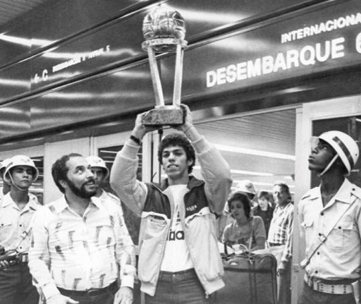 Este é o zagueiro Mozer trazendo a taça do título mundial do Flamengo, em 1981. Fonte: Jornal dos Sports.