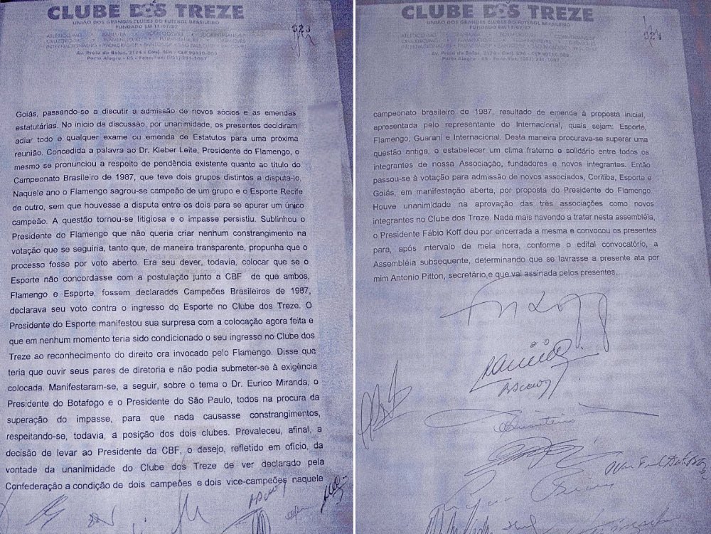 Em troca de sua adesão ao Clube dos 13, o Sport reconhece (documento em anexo), o Flamengo como campeão de 1987 junto do Sport. Juridicamente este documento não tem valor. Pode até ser pior para o Clube dos 13 e Flamengo sob acusação de coação e chantagem.