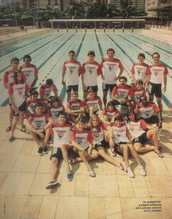 Grande foto!! Nadava no Flamengo nesta época, com meus irmãos, Murillo e Luiz Renato. Na foto, tem ainda o Renato Pinho (sentado à frente, de tênis azul), o Fabrício (ao lado esquerdo dele), o Fiúza (ao lado esquerdo do técnico Daltely), o Almir (ao lado esquerdo do Jorge Fernandes) e o psicólogo da equipe, o Paulo (em pé no extremo direito da foto).