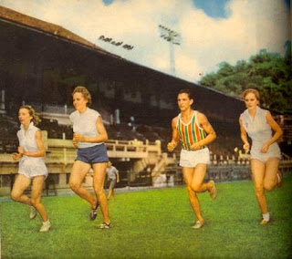 Teodora Breitkof, Liliam Poetscher, Ary Façanha de Sá e Hannelore Poetscher aparecem treinando no Estádio das Laranjeiras nos anos 50.
